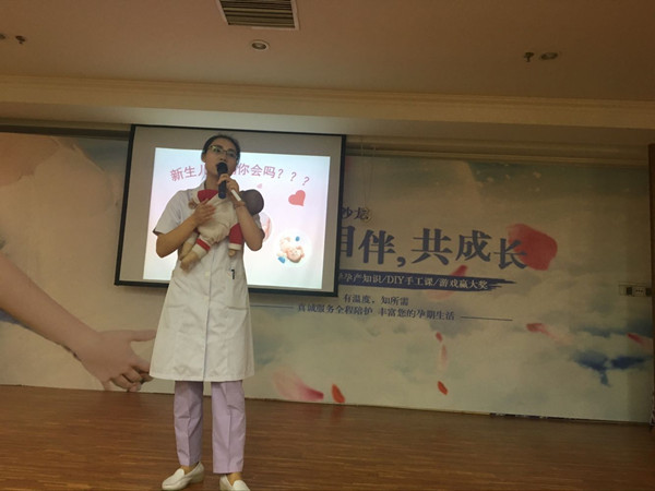 活动一开始月子中心主任刘燕先是为准爸妈们讲解了如何科学育儿,新生儿适合怎样的生长环境,新生儿常出现的生理性黄疸,新生儿晒太阳的技巧和注意事项等常识,更是为准爸妈们说到新生儿溢奶的护理,并邀请现场的准妈妈们上台练习,当新生儿溢奶时该怎样做等,为新生儿的到来做好充足准备。