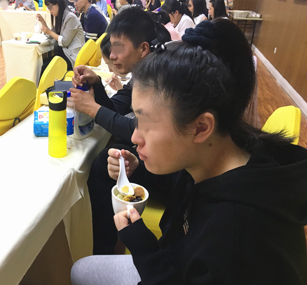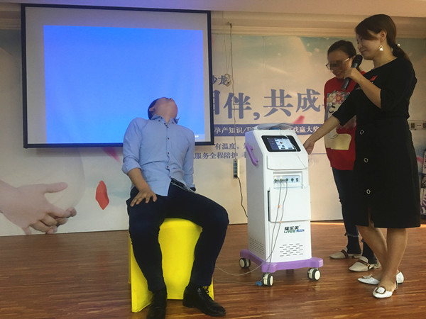 课程结束之后,现场客服还为孕妈妈们准备了由合肥白领安琪儿妇产医院行政总厨与专业营养师精心搭配烹调的特色营养餐。品尝完餐点之后,到了本次沙龙特色环节——分娩阵痛体验,一位准爸爸上台体验了分娩阵痛,大家纷纷为这位准爸爸鼓掌,现场其它的准爸爸们也进一步的理解到了准妈妈的辛苦。