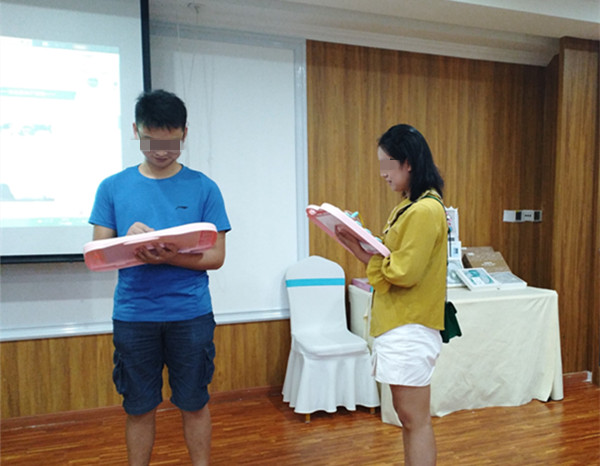 课程结束之后,主持人现场邀请了3对孕期夫妻,针对伴侣的日常生活习惯或者喜好等小问题进行了题板同步答题比赛,默契度最高的一对获胜。而回答正确题数最多的一对准爸妈就可以获得精美礼品一份——答题写字板。比赛现场十分有爱,准爸妈们都互相表达了对彼此的关爱。