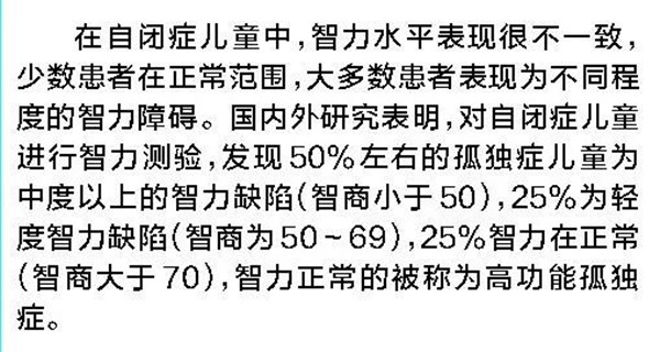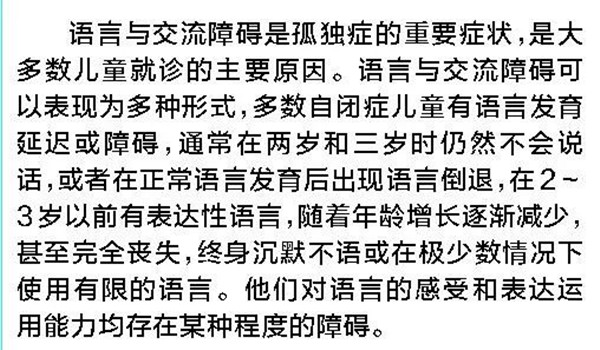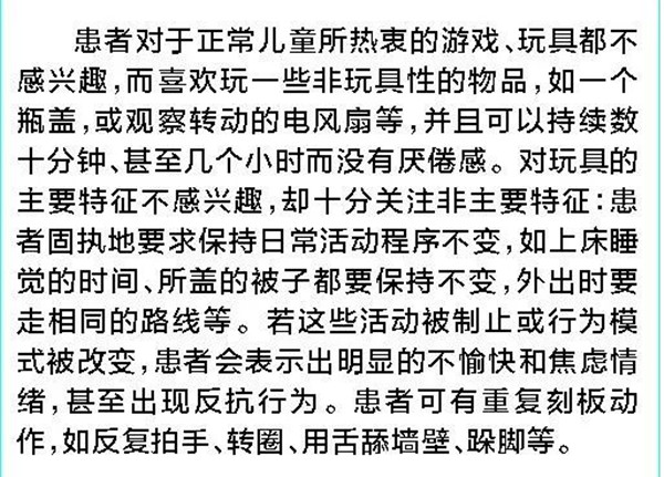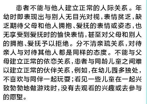 儿童自闭症又叫儿童孤独症,是广泛性发育障碍的一种亚型,以男性多见,起病于婴幼儿期,主要表现为不同程度的言语发育障碍、人际交往障碍、兴趣狭窄和行为方式刻板。约有3/4的患者伴有明显的精神发育迟滞,部分患儿在一般性智力落后的背景下某方面具有较好的能力。